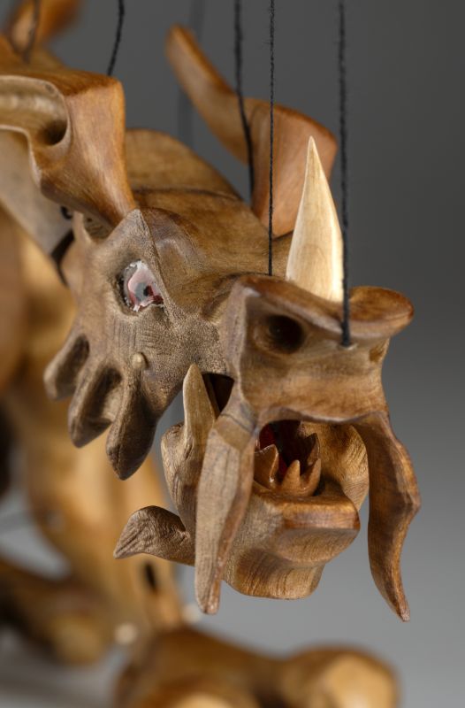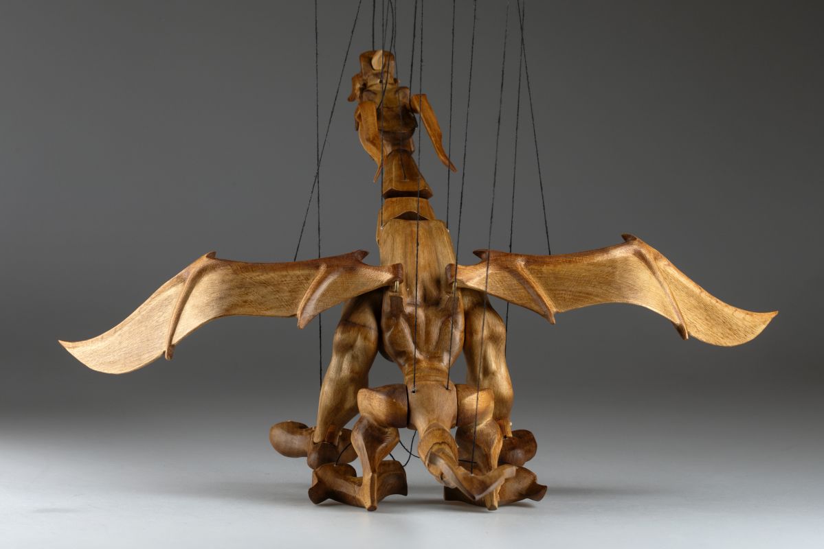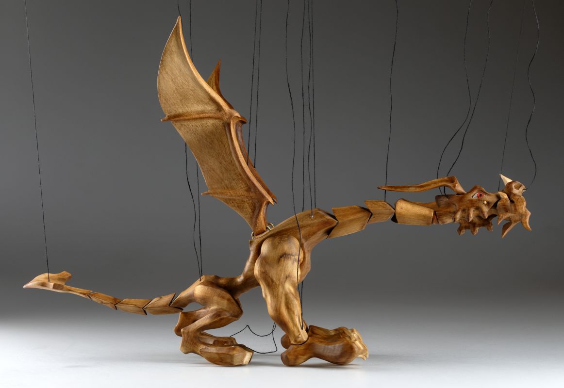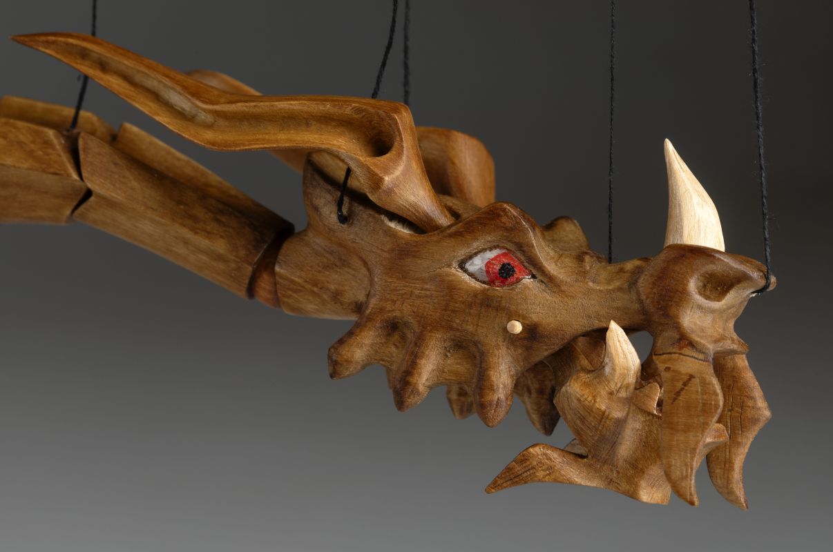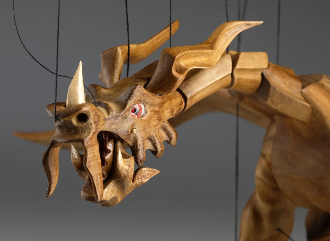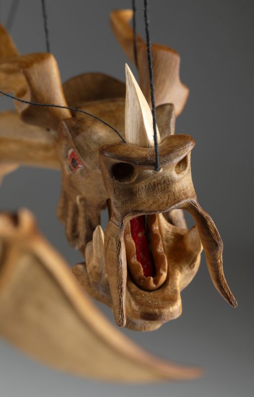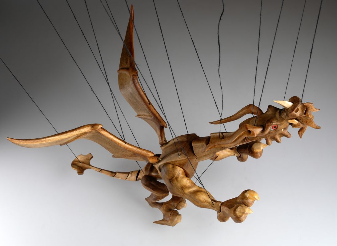 Tato působivá dřevěná marioneta draka spojuje řemeslnou preciznost, výraz a plnou pohyblivost. Pečlivě ručně vyřezaná z masivního dřeva, vyniká dynamickou anatomií, silnými liniemi a živým, výstižným charakterem. Díky kloubové konstrukci a jemnému vedení nití se drak dokáže plazit, řvát, útočit nebo se vznášet vzduchem – vše s dramatickým nádechem pohybu.