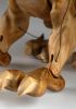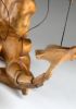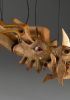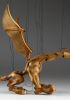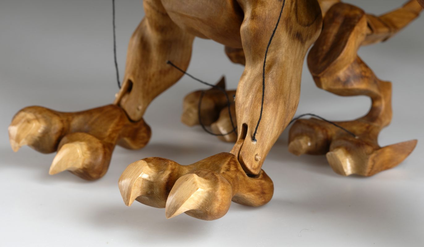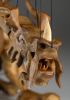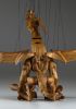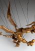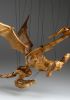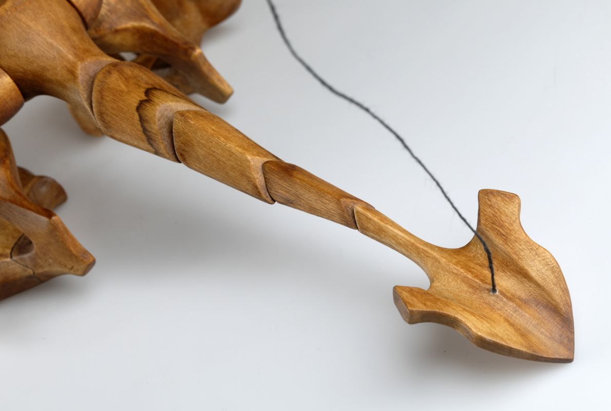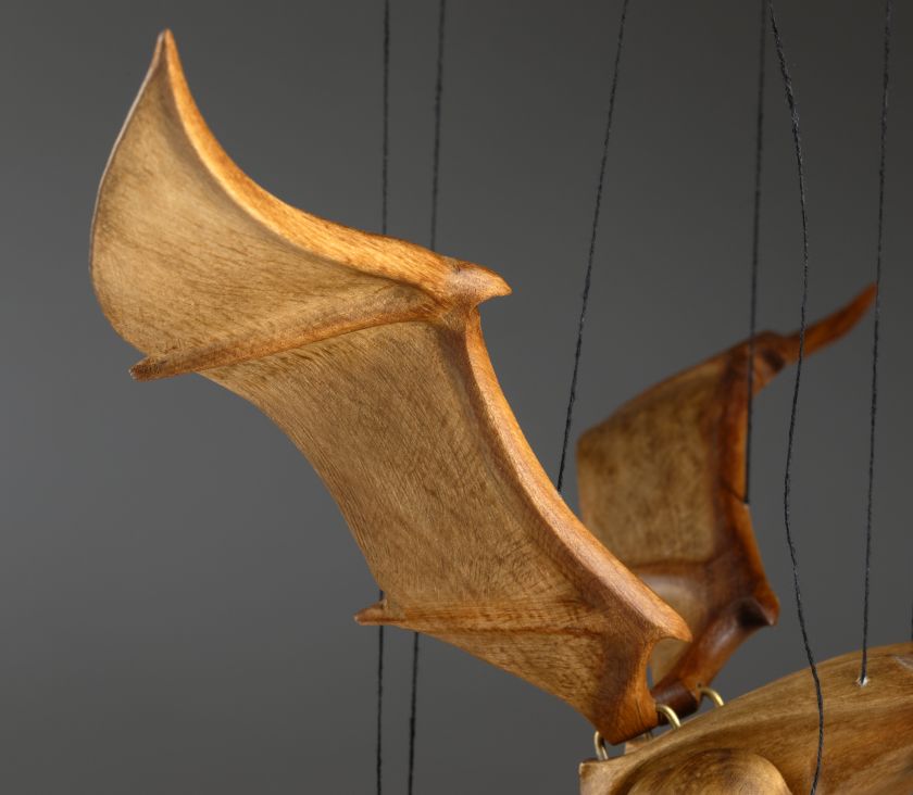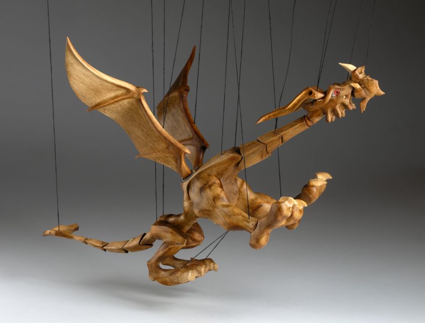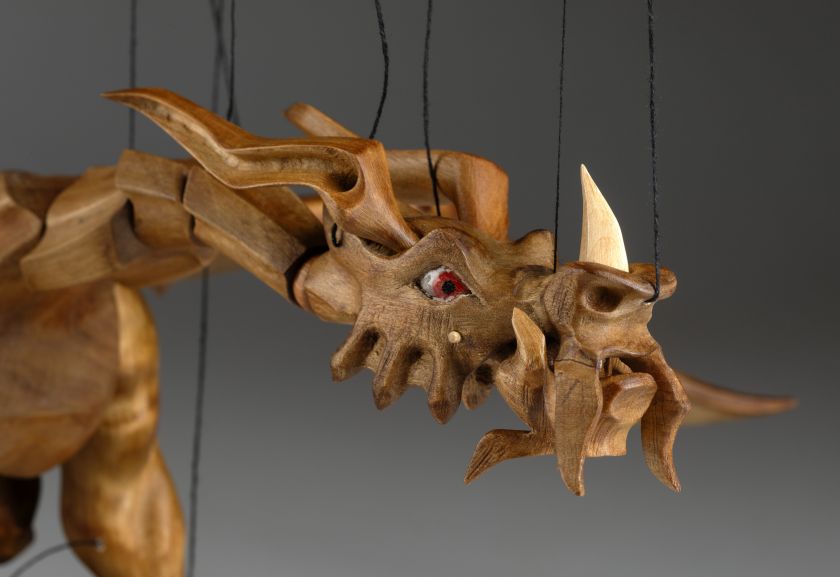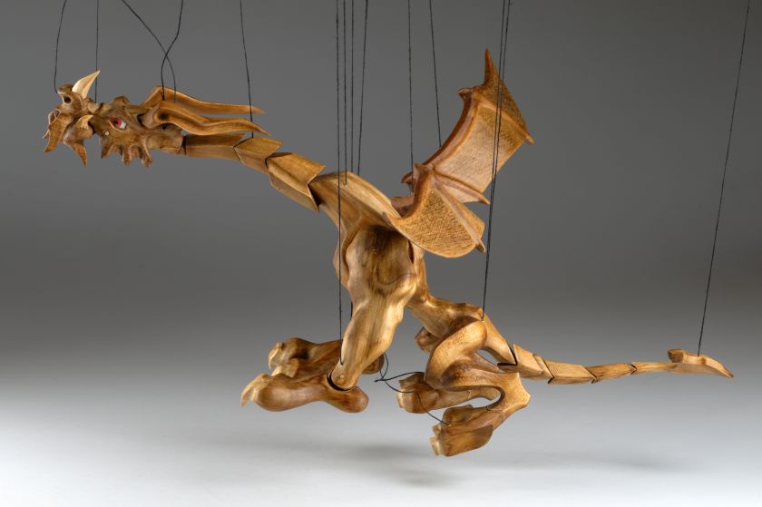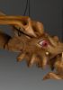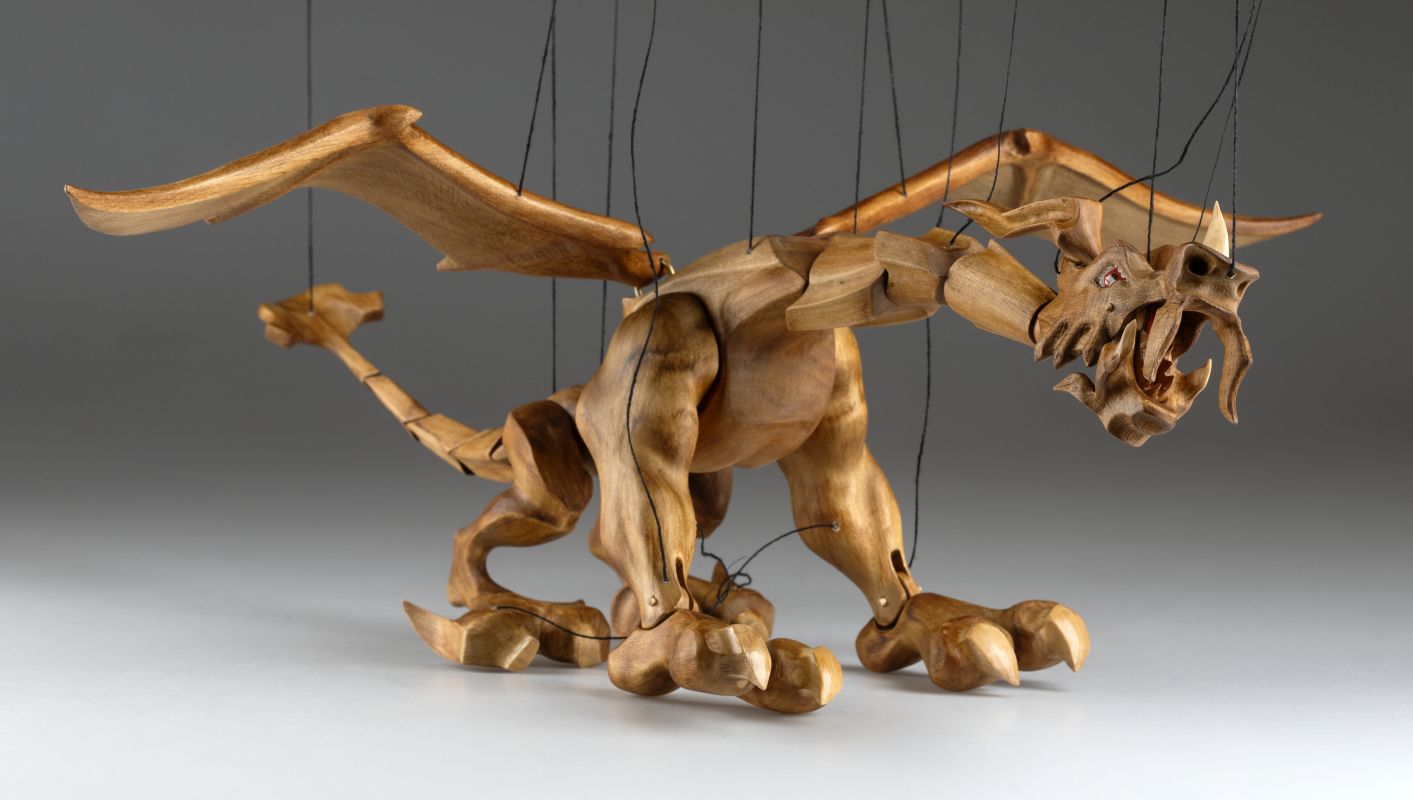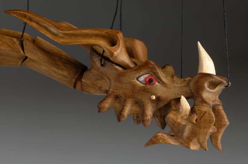 Tato působivá dřevěná marioneta draka spojuje řemeslnou preciznost, výraz a plnou pohyblivost. Pečlivě ručně vyřezaná z masivního dřeva, vyniká dynamickou anatomií, silnými liniemi a živým, výstižným charakterem. Díky kloubové konstrukci a jemnému vedení nití se drak dokáže plazit, řvát, útočit nebo se vznášet vzduchem – vše s dramatickým nádechem pohybu.