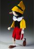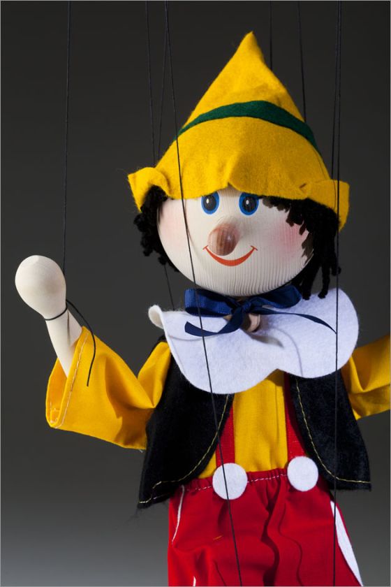 Tento veselý Pinocchio je vysoký cca 35 cm. Celý je vyrobený ze dřeva, jeho šaty jsou ručně šité a detailně propracované. Obličej má malovaný zdravotně nezávadnými barvami a jeho vlasy jsou vyrobeny z vlny. Loutka má snadno ovladatelné vodící zařízení.