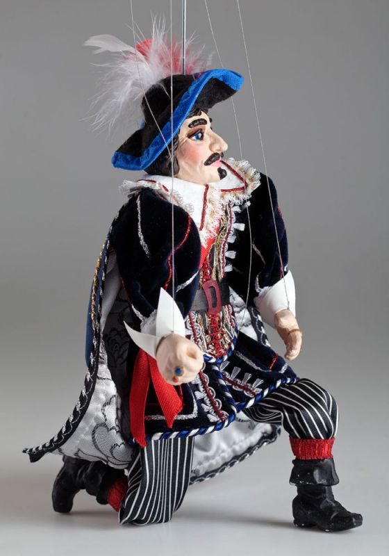 Mušketýři jsou známí pro svou nebojáctnost a čest. Naše loutka mušketýra Atose neí jiná. Vždy bude bojovat za správnou věc a dámu svého srdce.Loutky jako tento mušketýr jsou vyráběné v limitovaných edicích po pár kouscích. Hlava, ruce a nožičky jsou odlévané a ručně malované, tělíčko (kostra) je z lipového dřeva. Loutka má tradiční ovládání, s vahadlem je spojena pevným drátem a k ovládání rukou a nohou jsou použité klasické nitě.Podívejte se na krásnou a detailní práci na nádherném na míru ušitém kostýmu. Je vyroben z vysoce kvalitních látek s velkým akcentem na precizní zpracování. Krásný klovouk zdobí pravé peří. Vysoká zdobnost je pro tuto kolekci naprosto typická.