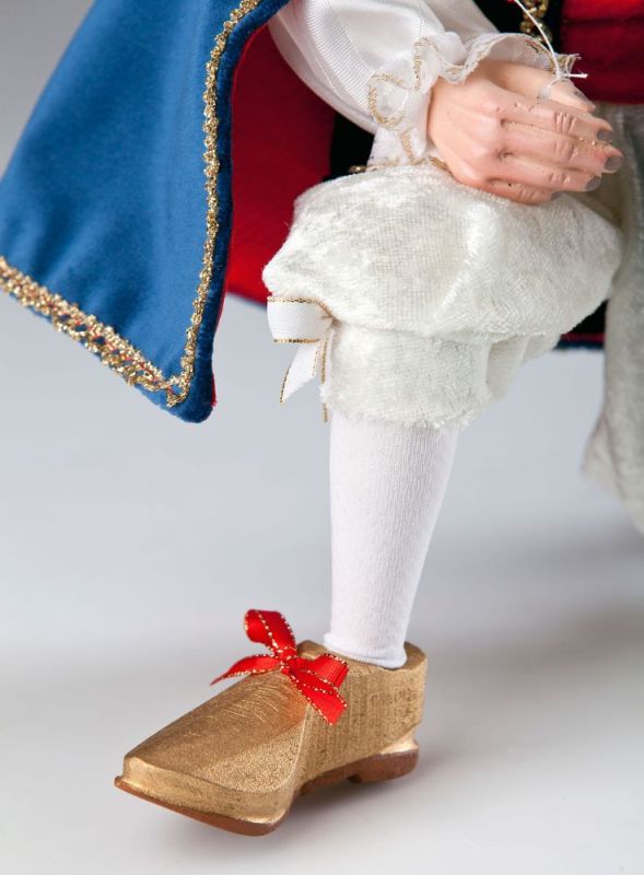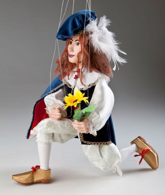 Statečný, pohledný a hlavně věčně zamilovaný, takový je princ Damian. Jeho stále usměvavý obličej lemují hnědé vlnité vlasy a elegantně posazený klobouček s bílým perem. I jeho ručně šité šaty jsou opravdovým mistrovským dílem. Bílá košile, modrá vestička se zlatou výšivkou a rudě podšitý pláštík, dodávají naší loutce ten správný vzhled šlechtice.