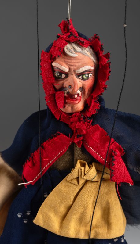 Diese antike Hexen-Marionette stellt eine ikonische Figur aus tschechischen Märchen und Volkserzählungen dar. Mit wildem Gesichtsausdruck, scharf gezeichneten Zügen und auffälligem Kostüm erzeugt sie eine magische und zugleich unheimliche Atmosphäre. Das rote Kopftuch, der dunkelblaue Umhang und der zerfranste Saum des Rocks verleihen der Marionette ein authentisches Aussehen, das den traditionellen Darstellungen von Hexen und Zauberinnen entspricht.