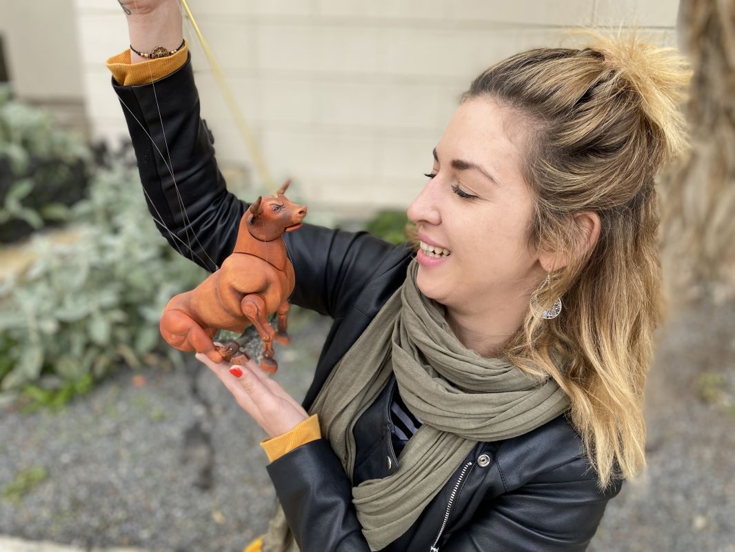 Handgeschnitzte Marionettenpuppe eines Stiers, der Rauch aus seinen Nasenbohrern blasen kann