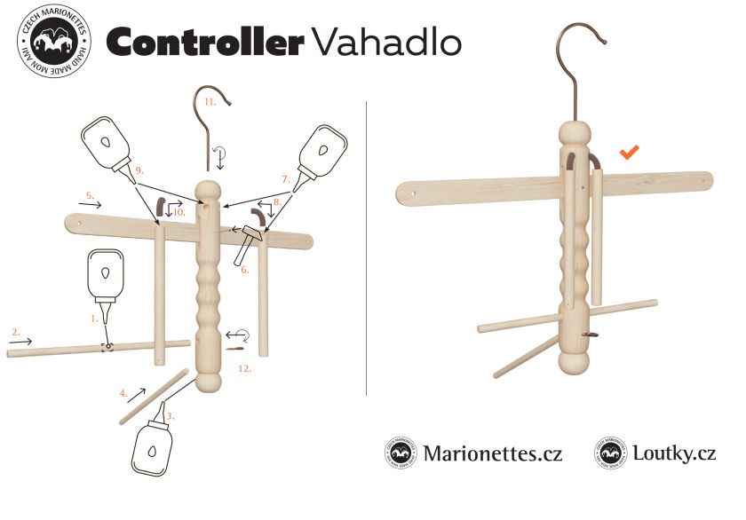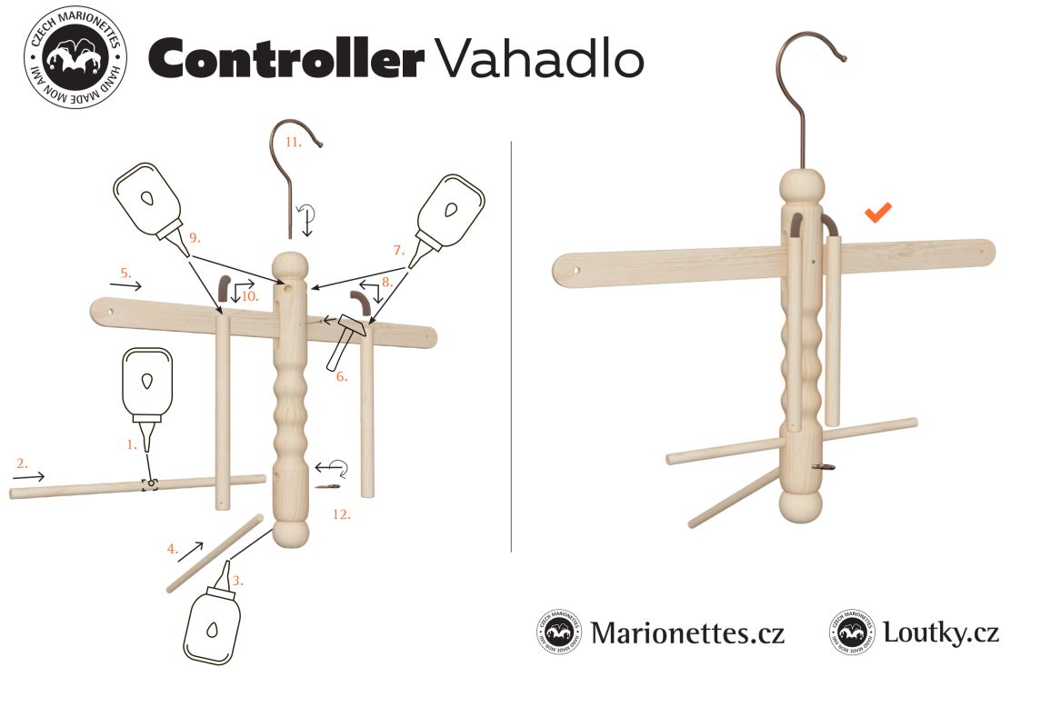 Vertikales Spielkreuz für Marioenttes von 45 bis 80 cm, auch als Skupa-Controller bekannt. Der Kipphebel enthält eine Videoanleitung zum Bespannen der Marionette. Die Spielkreuz wird zerlegt geliefert. Die Montagezeit beträgt ca. 15 Minuten.