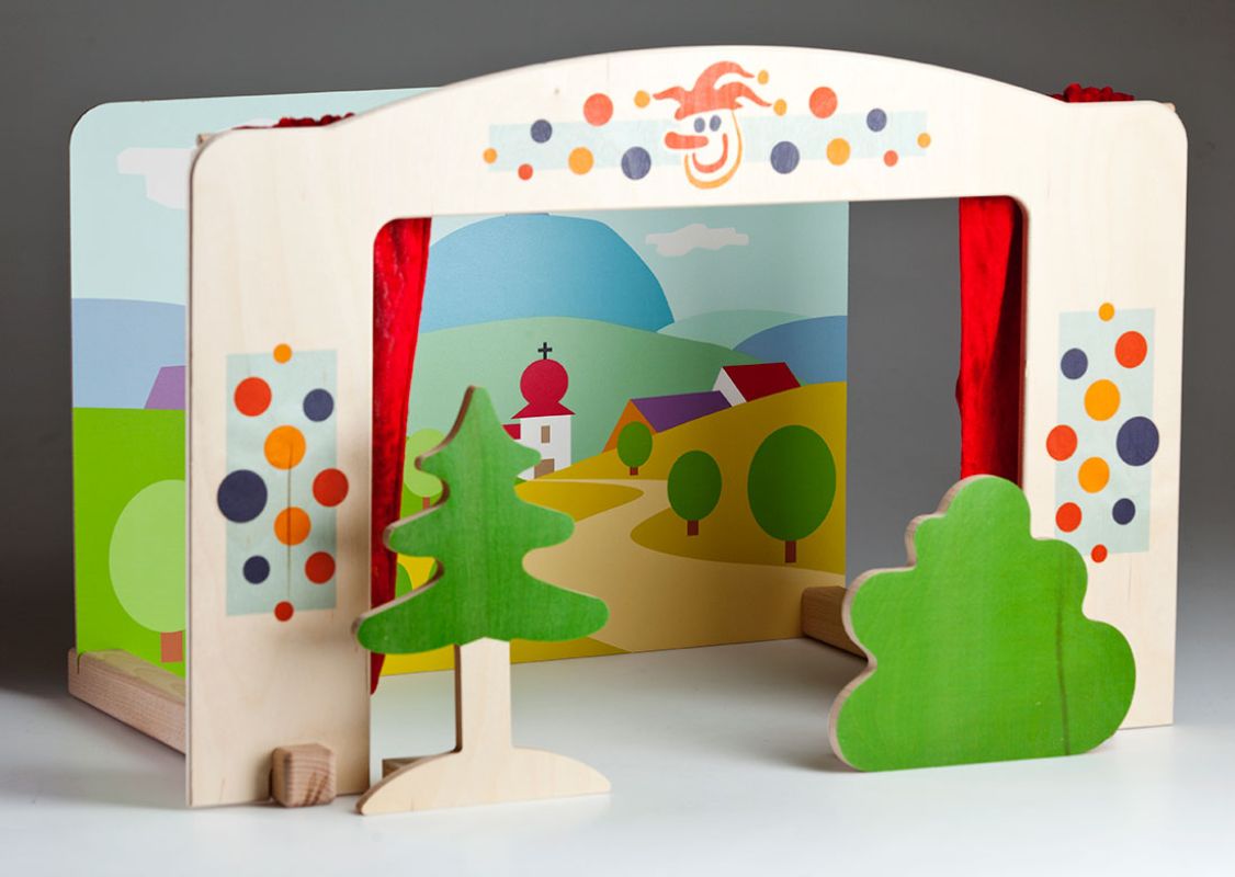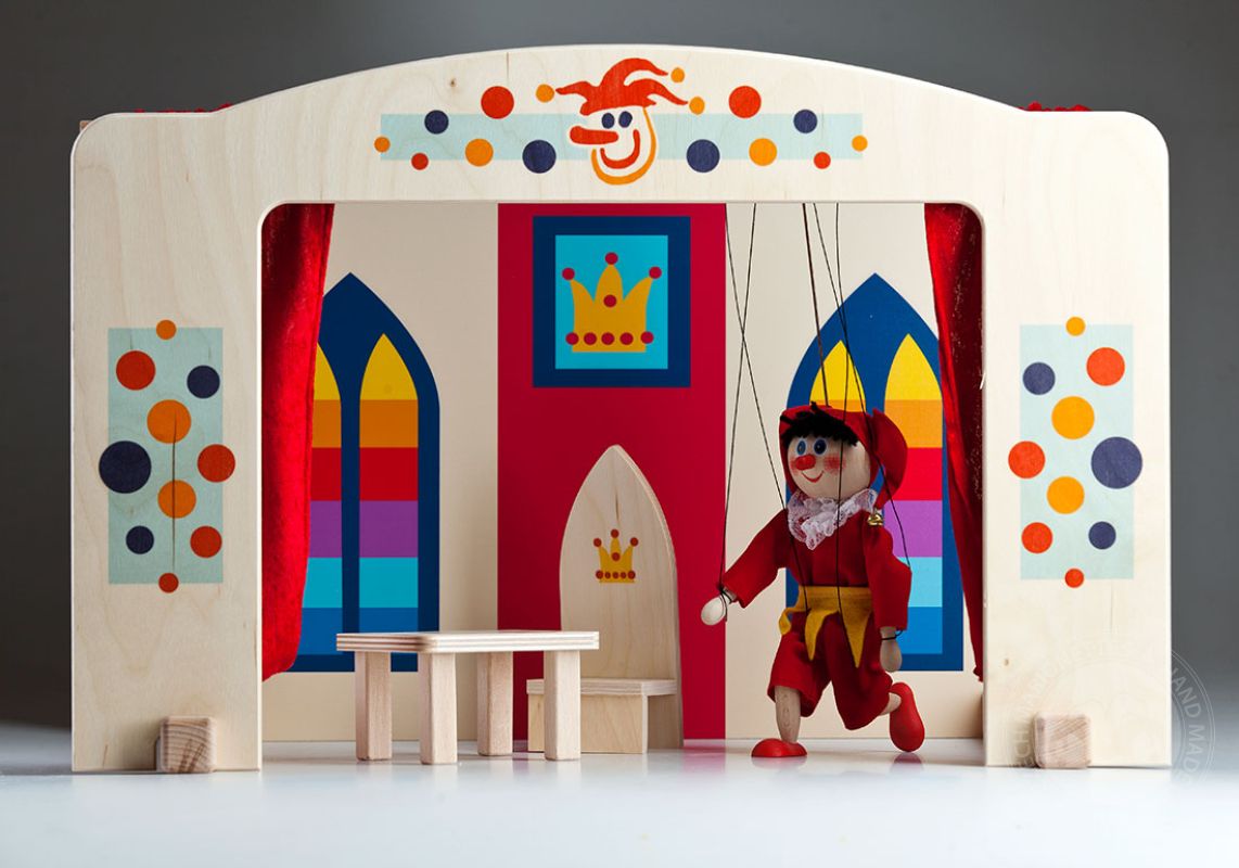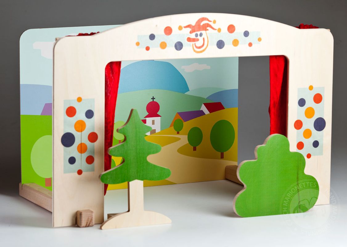 Our wooden theatre for marionettes offer you a plenty of oportunities how to entertain yourselves or your friends and family. Four neutral backgrounds will make your experience really lifelike and when your children prepare a performance for you, you will feel like in the real theatre. Don’t forget to dress up nicely, make yourself comfortable and enjoy the story for instance of a brave jester who saved the beautiful princess and killed the frightening dragon.