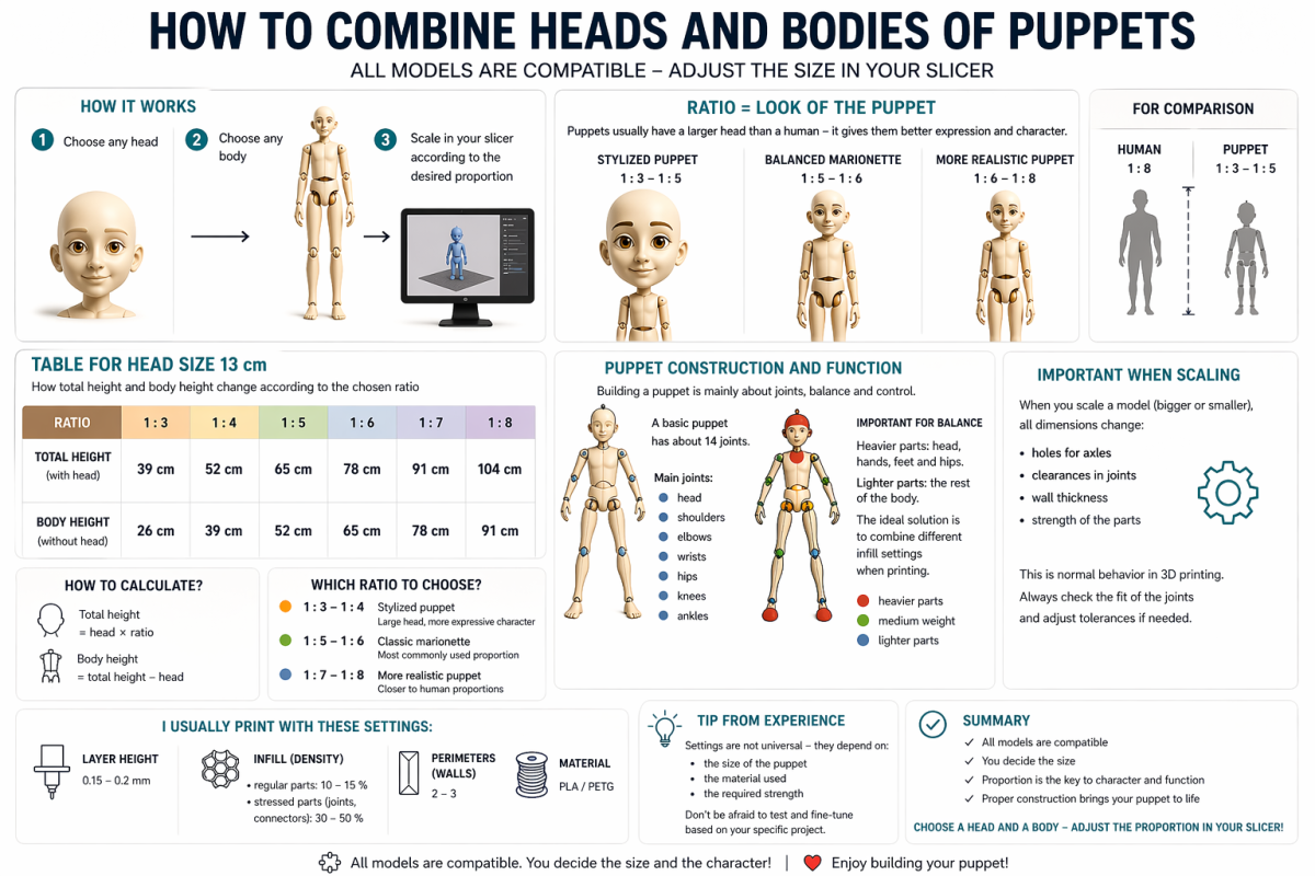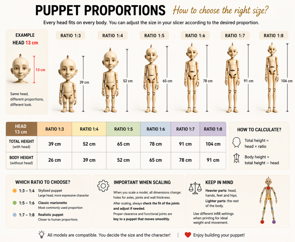 My printing setting for those parts are 20-30 % infill, 2 perimeters (bigger the marionette is less infill I use)