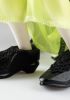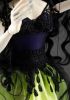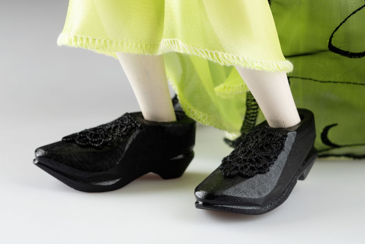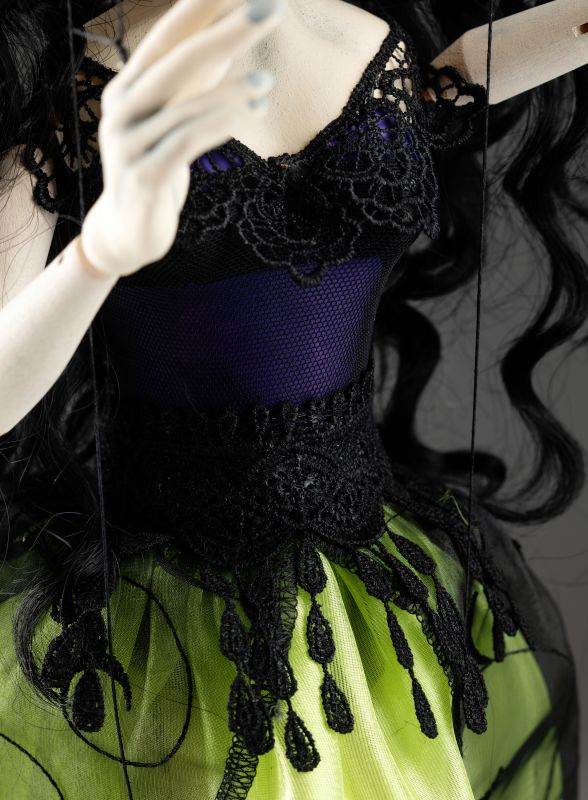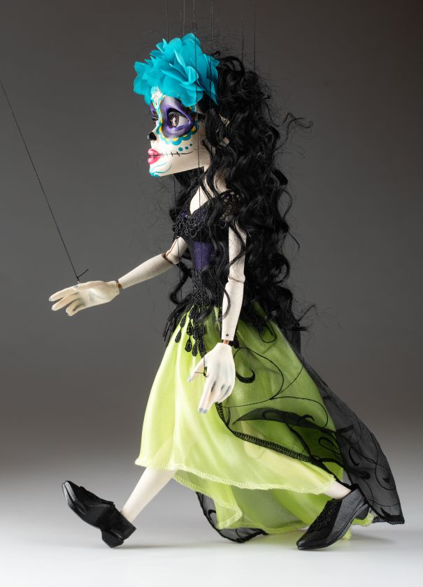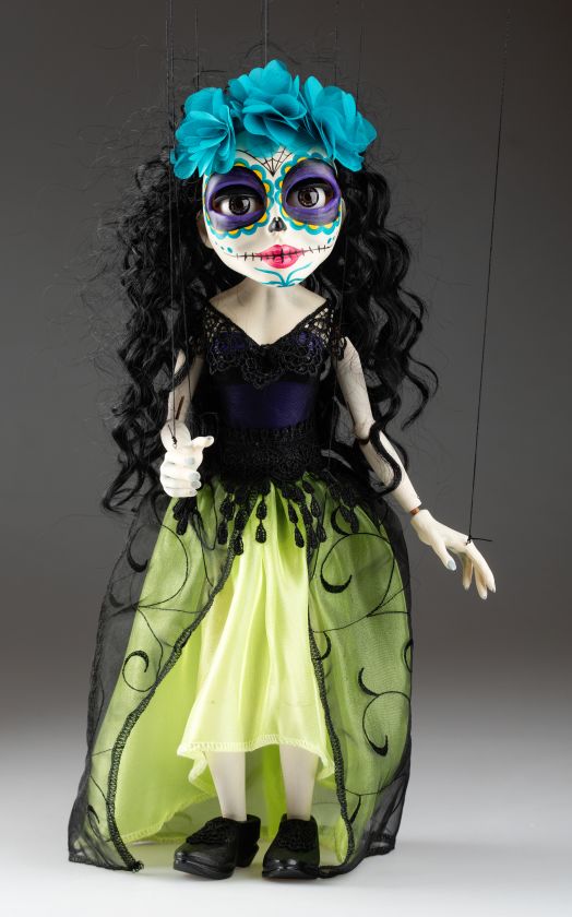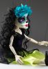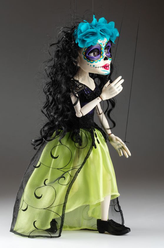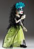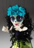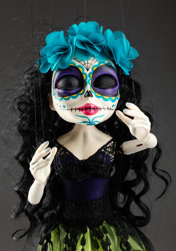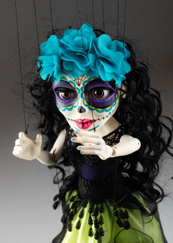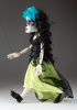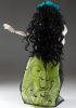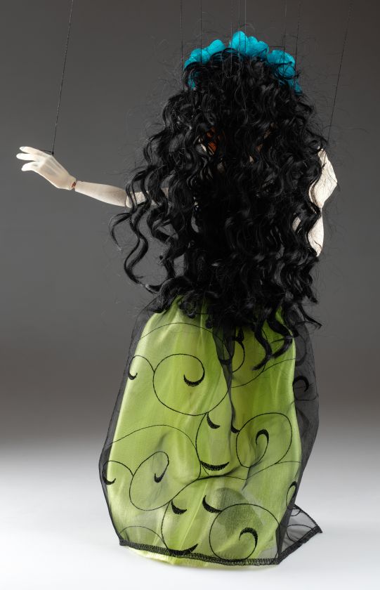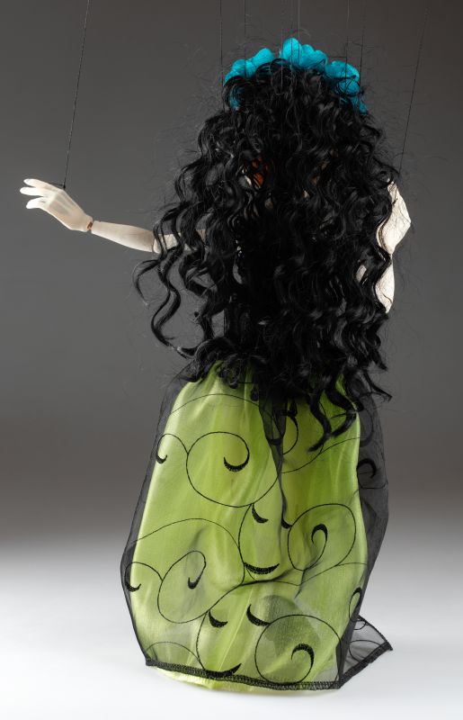This handmade marionette is marvelous in so many ways. The headband from blue flowers decorates her long curly black hair, her face is carefully handpainted into the tiniest details, and her outfit with black embroidery and a green skirt just makes her appearance even more outstanding.