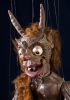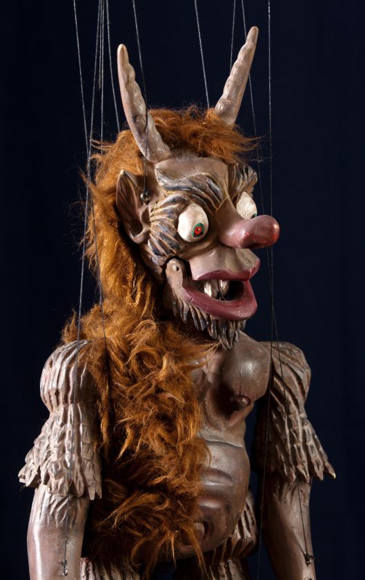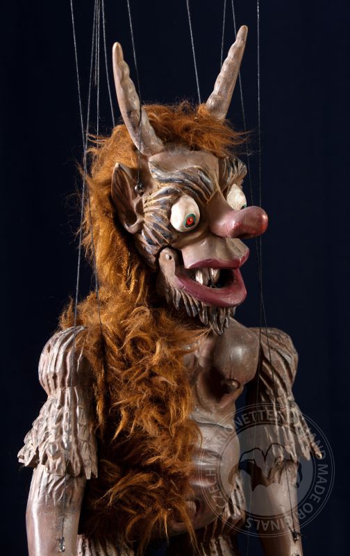 This marionette is truly unique. His entire body is carved in detail from linden wood and the only textile adornment he wears is a fur coat, which is meant to represent the hair growing all over his body. A piece of fur also grows out of his tail, which the devil is often depicted with. His originality is enhanced by his movable jaw and large bulging eyes. In short, an original that will delight any puppet enthusiast.
