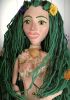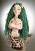 It is easy to imagine this mermaid playing with dolphins in the sea. She’s very happy and always smiling. Her eyes are green, sparkling, and playful. She’s got rich wild green hair adorned with flowers. Our Mermaid is not wearing much, but she’s still very stylish. Besides the fishtail, so typical for mermaids, she’s using fishnet to cover herself. Her face is csted, body and hand are from lime wood and mermaid tail is soft and made from textiles. This lady will make you fall for her in no time.