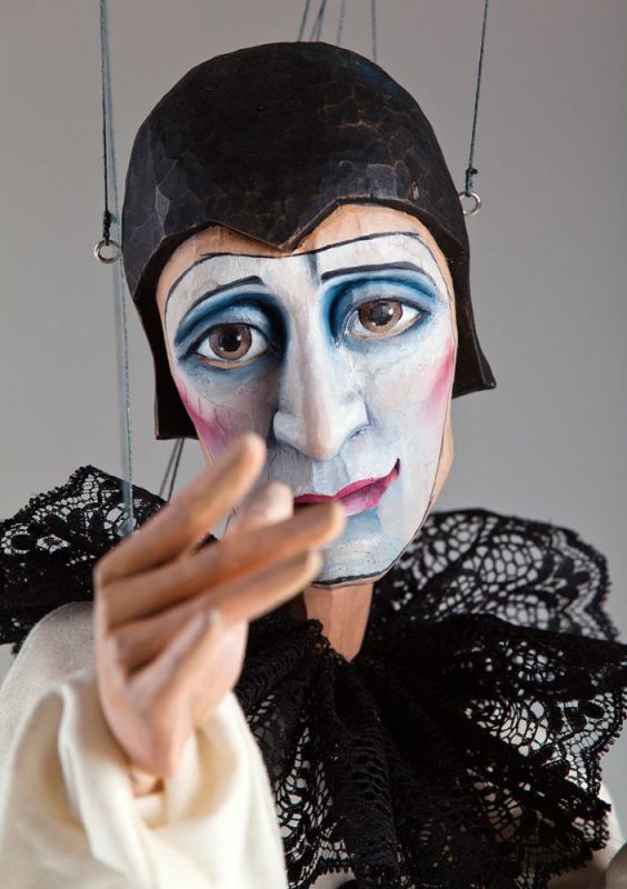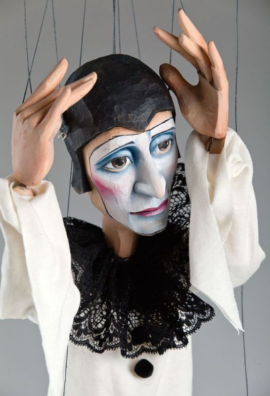 Melancholic Pierrot Czech Marionette is a wooden hand-carved beauty in a classic style—a very detailed puppet with a characteristic facial expression and typically a black and white outfit.