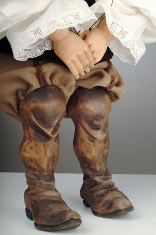 This noble Aristocrat is meticulously hand-carved from limewood. Another renaissance masterpiece from Krcal. Every inch is hand-carved and hand-painted. His unique clothing is also hand-sewn. Notice the amazing detail in his facial expression, and even in his hand-carved wooden boots!