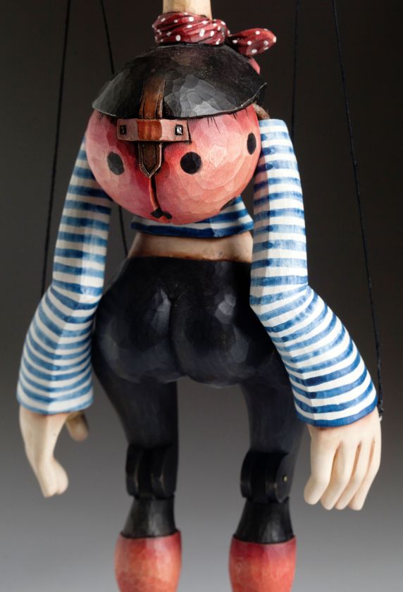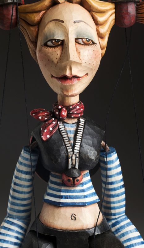 This wonderful marionette is beautiful in so many ways. She's playful, jolly, and full of amazing details. The whole body is hand-carved from wood, it's and precisely hand-painted.  And the aesthetic impression? Her features perfectly suit the face of a free spirit and elegance.