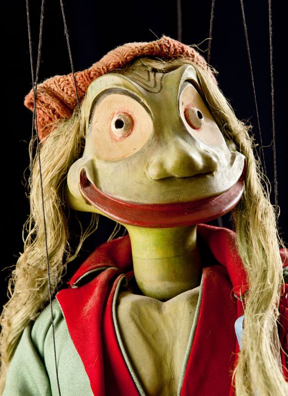 Toda la marioneta está tallada en madera de tilo, incluyendo la cara, los ojos y los zapatos. El disfraz del espíritu del agua está hecho de varios tipos de textiles, su chaleco rojo contrasta maravillosamente con el color verde de sus pantalones. También hay que notar las membranas que son visibles entre sus dedos. Con su expresión asombrada, es una pieza histórica verdaderamente original.