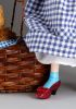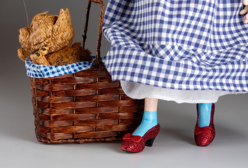 Sigue el camino de baldosas amarillas con esta encantadora marioneta de Dorothy de *El Mago de Oz*. Con su clásico vestido de cuadros azules y sus zapatos rojos brillantes, Dorothy lleva a su fiel compañero Toto en una cesta forrada.