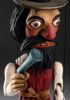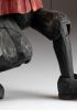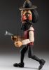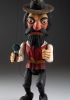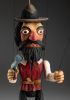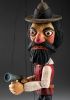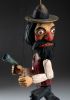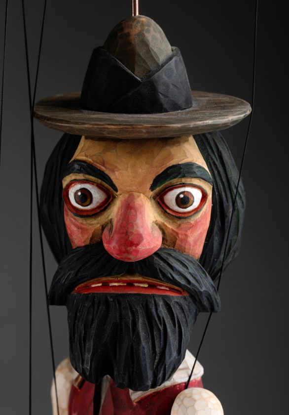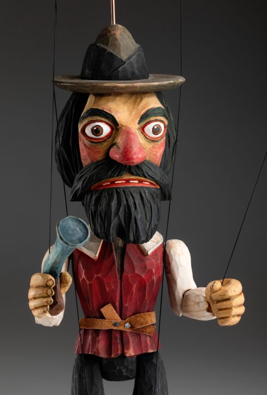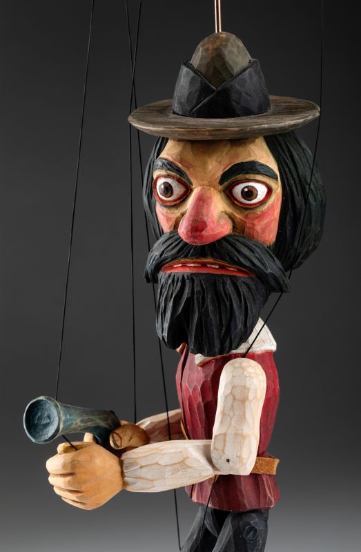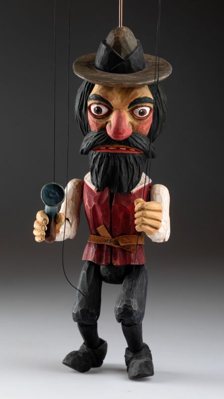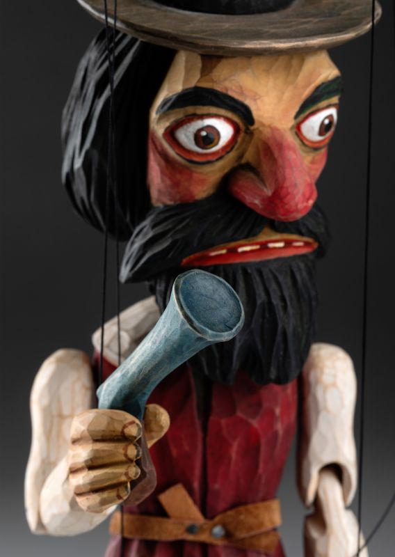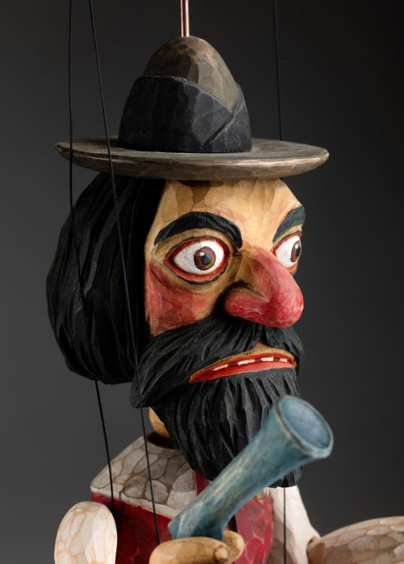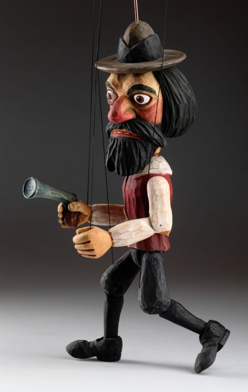 Cette marionnette unique de bandit est un véritable chef-d'œuvre, entièrement faite à la main et soigneusement sculptée dans du bois. Le bandit arbore un chapeau noir distinctif, une barbe noire sauvage et une expression typiquement malicieuse dans les yeux, donnant à la marionnette le caractère authentique d'un héros robuste mais charmant. Dans une main, il tient un petit pistolet, soulignant son caractère espiègle et son habileté dans la recherche de trésors, tandis que son autre main est fermement serrée en poing, prête pour l'action. Son gilet rouge vif avec une ceinture en cuir complète ce look à la fois ludique et robuste, caractéristique des personnages des contes populaires tchèques.