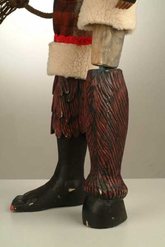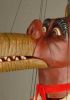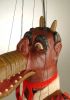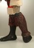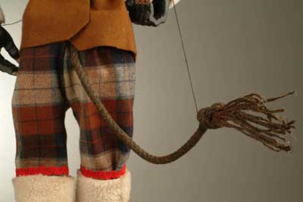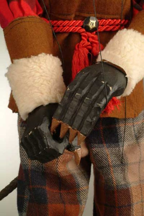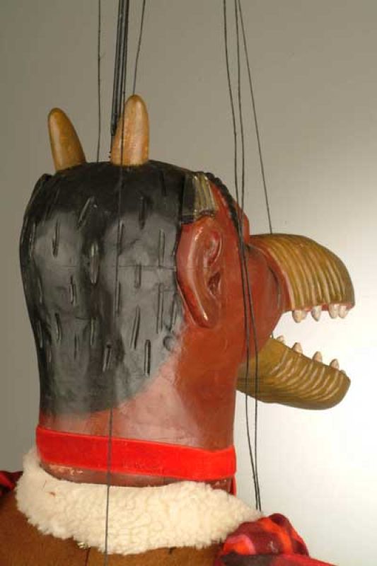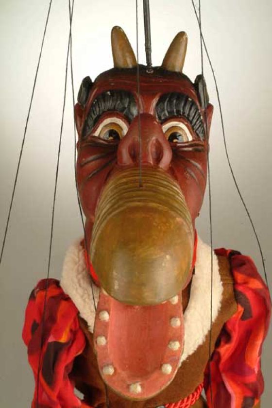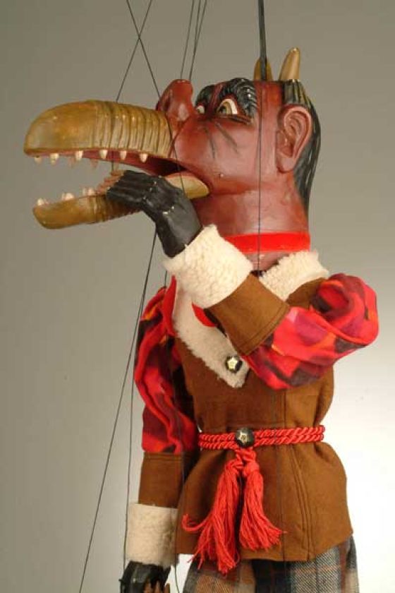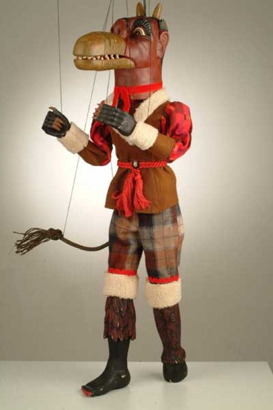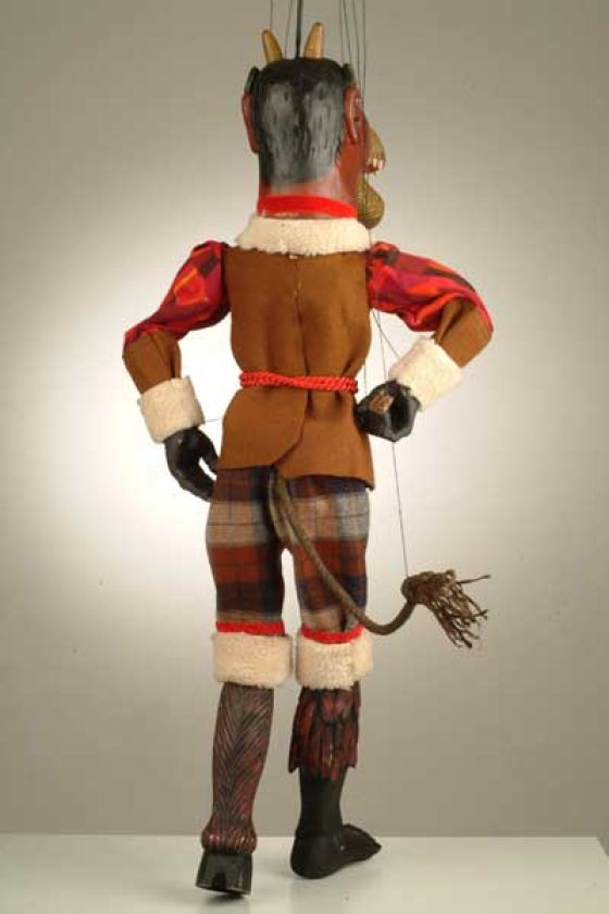 Cette marionnette ancienne du 19ème siècle possède de nombreux détails originaux. Il a une mâchoire mobile, un certain nombre de dents dans la bouche, des griffes sur ses mains et, au lieu d'une jambe, bien sûr un sabot. Le pantalon à carreaux du diable est décoré de fourrure, il porte un manteau avec de belles manches décorées et il ne doit pas manquer la queue.
