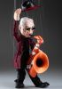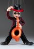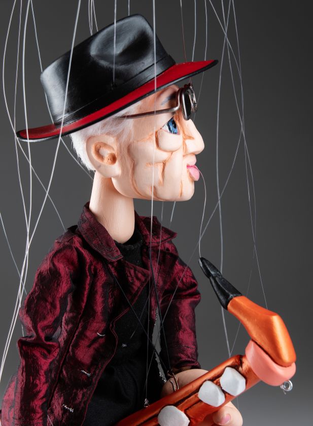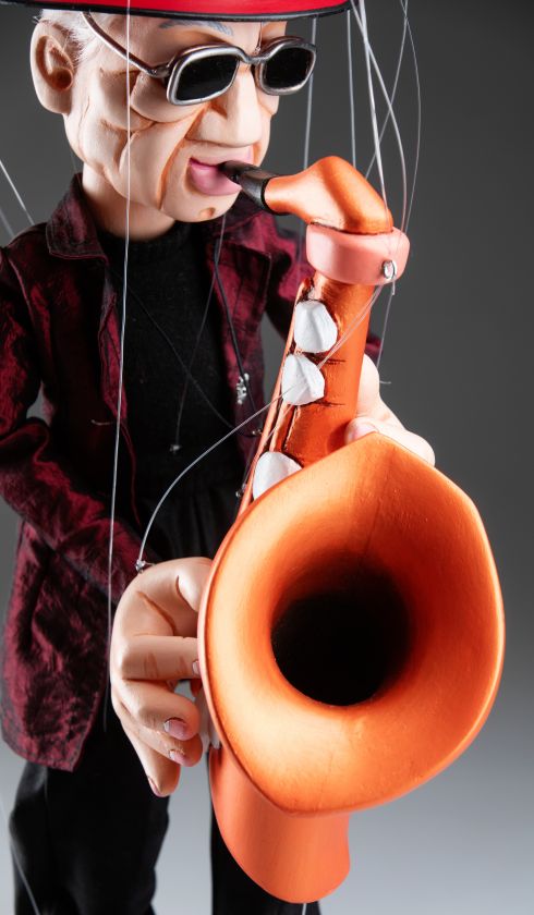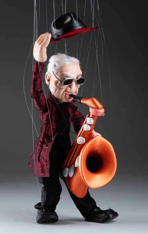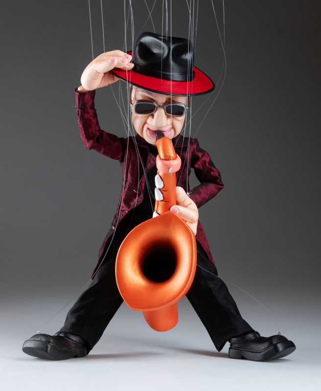 Vêtue d’un manteau texturé rouge profond, d’une tenue noire et d’un chapeau emblématique avec des lunettes élégantes, elle incarne le charme d’un véritable artiste. Son saxophone en bois détaillé ajoute une touche dynamique, faisant de cette marionnette non seulement un magnifique objet de collection, mais aussi un hommage à la culture jazz.