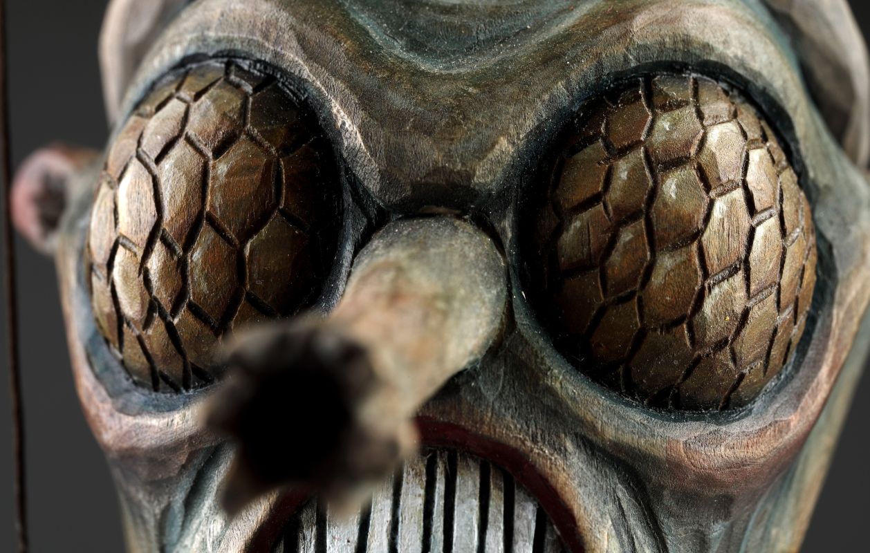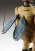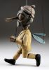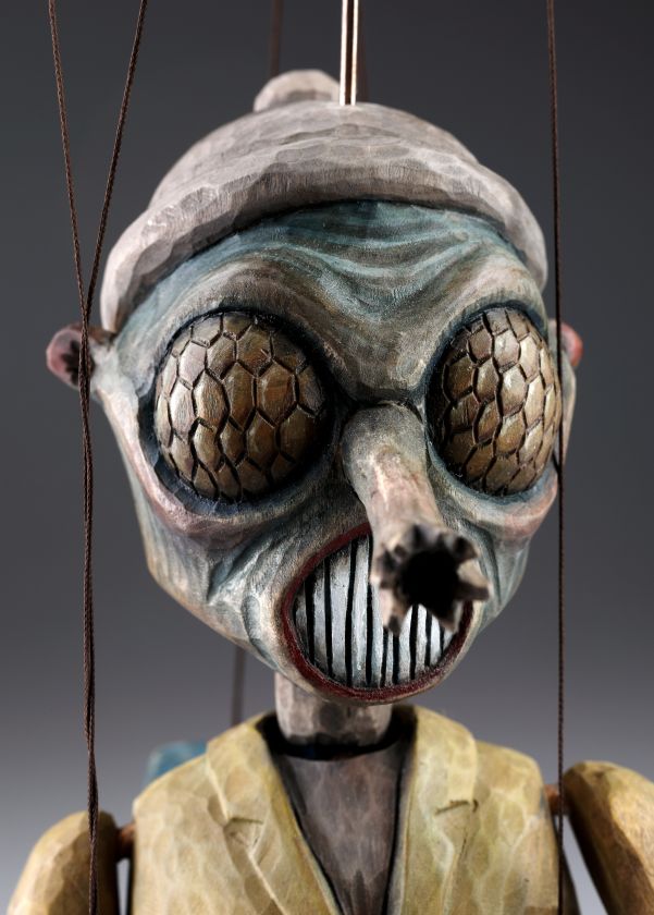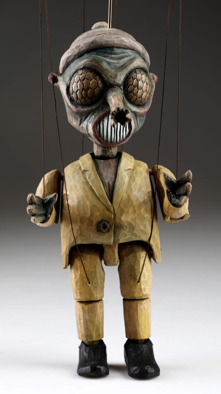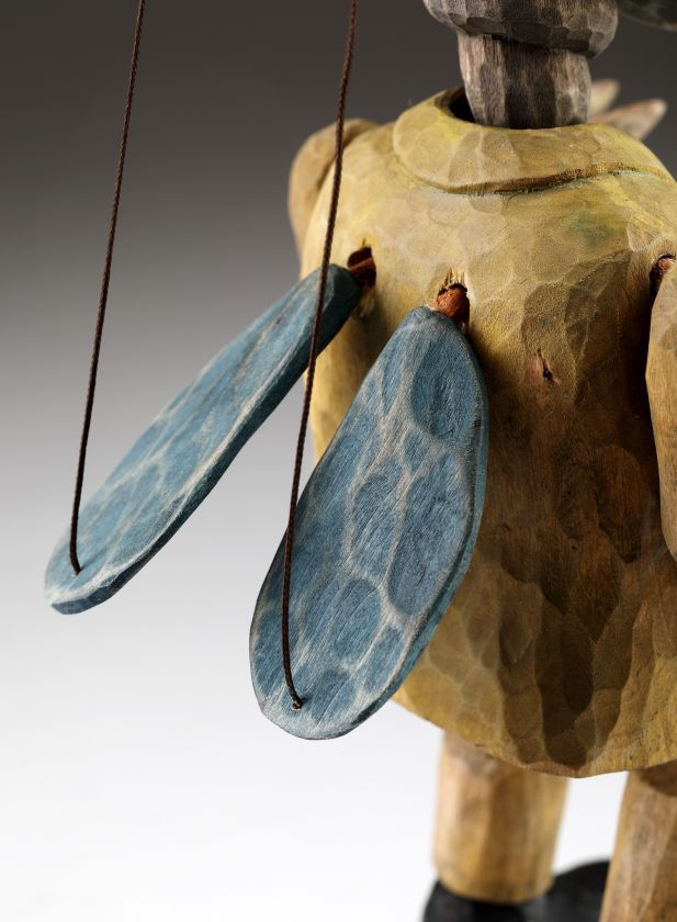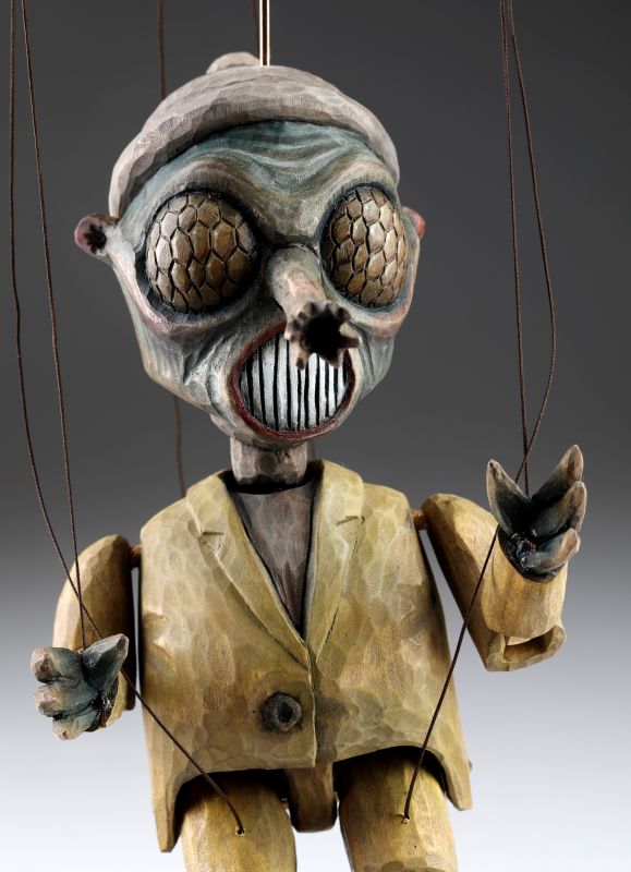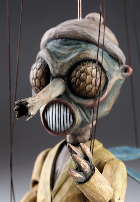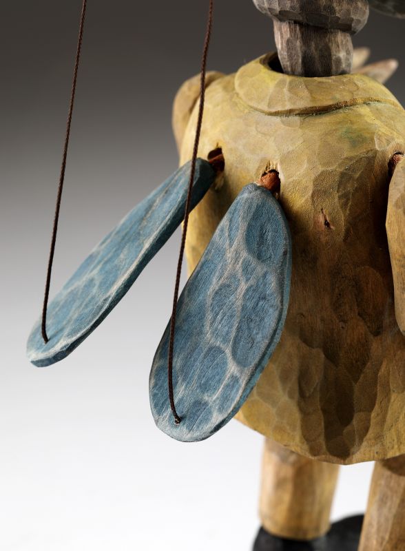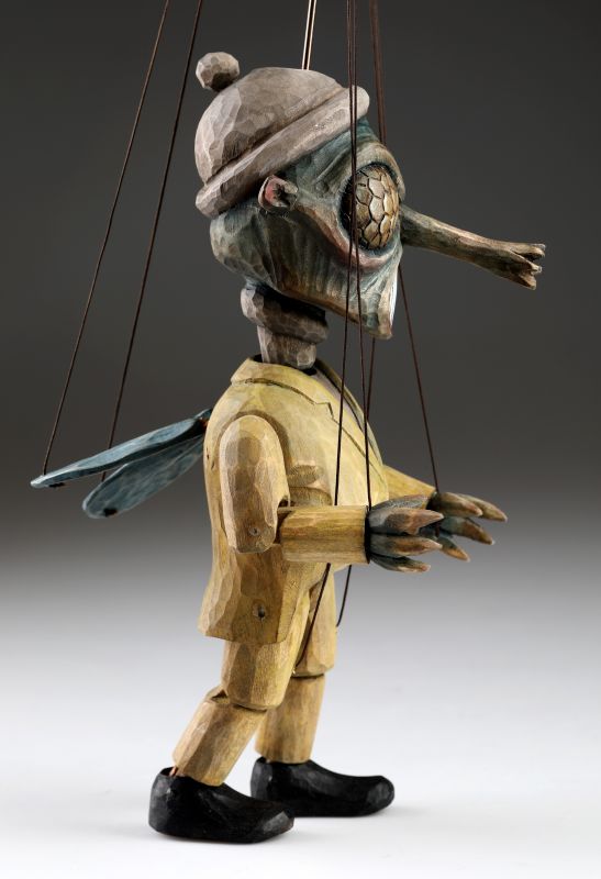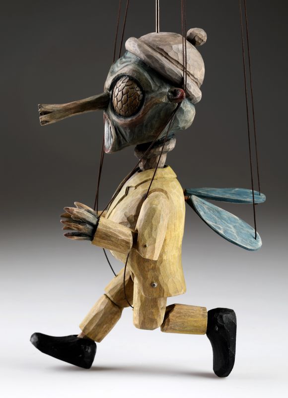 Une marionnette mouche en bois stylisée ressemblant à un personnage de bande dessinée est sculptée dans un style classique.