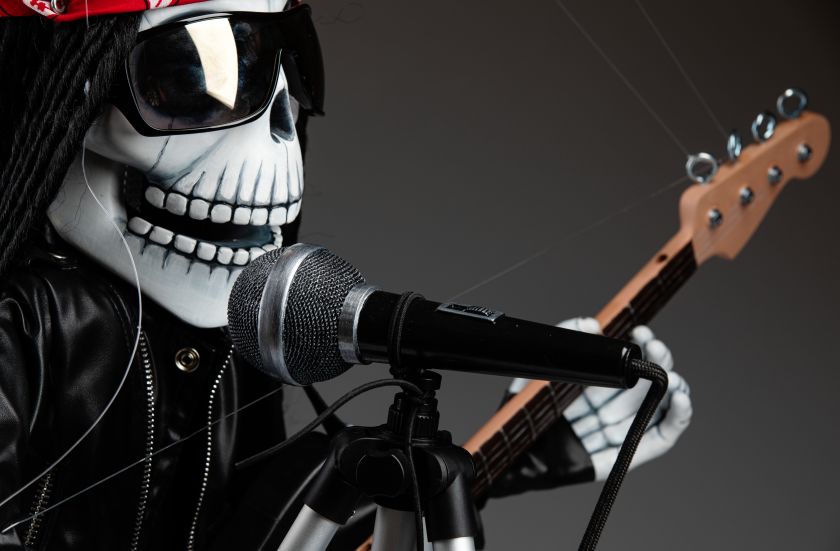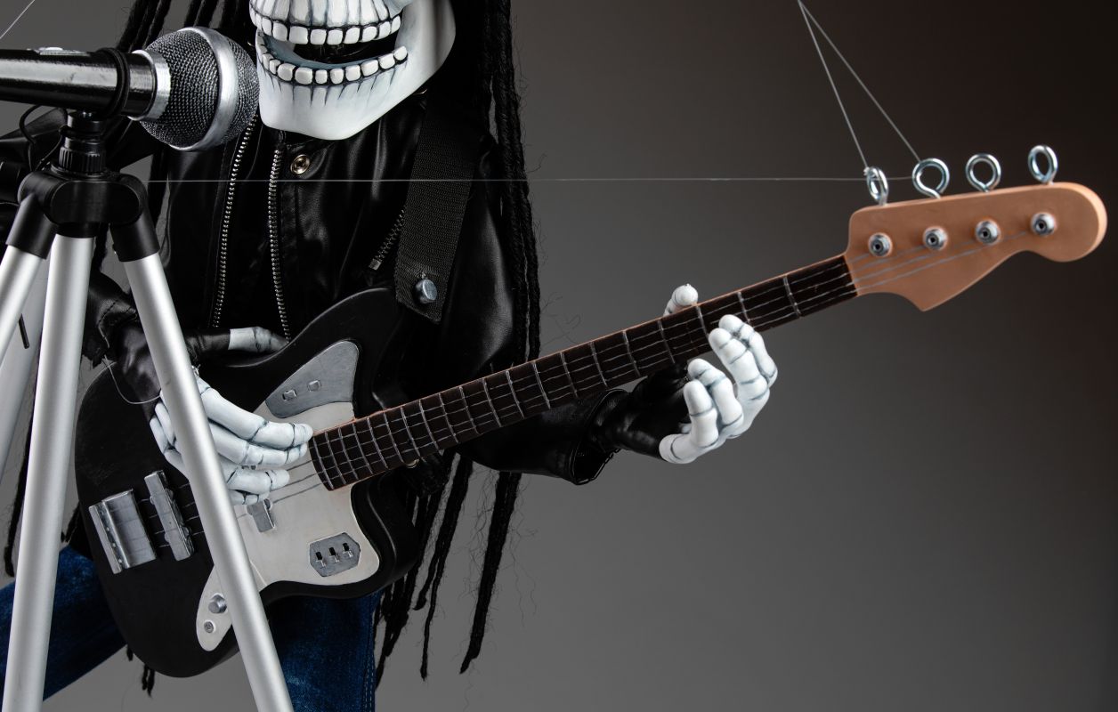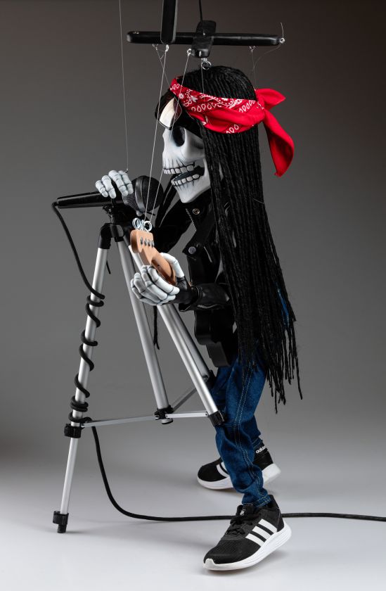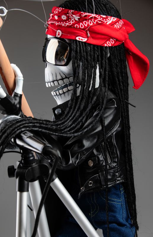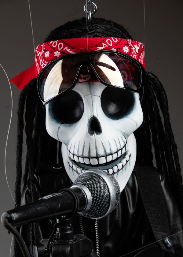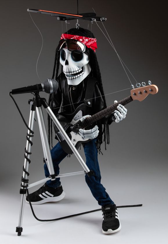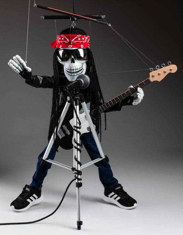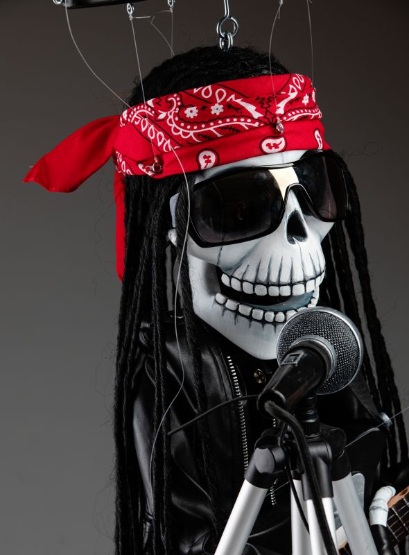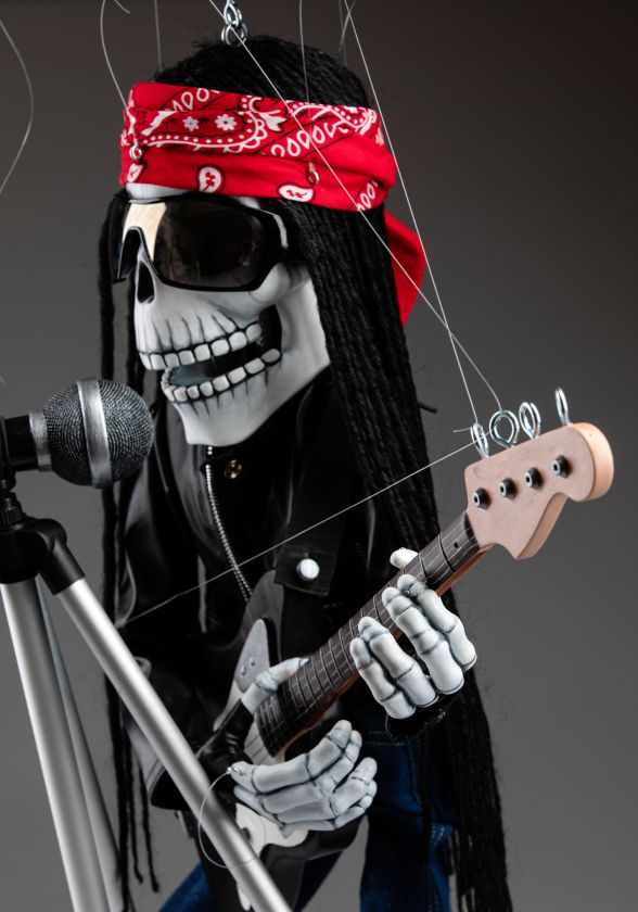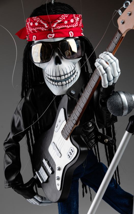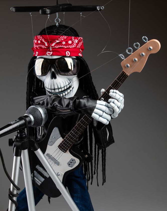 Une marionnette qui est si inhabituelle à bien des égards et qui a toujours l'ambiance de la fabrication traditionnelle de marionnettes. Cette marionnette squelette rockstar chantante va certainement faire vibrer votre monde. Une marionnette fantastique pour les performances.