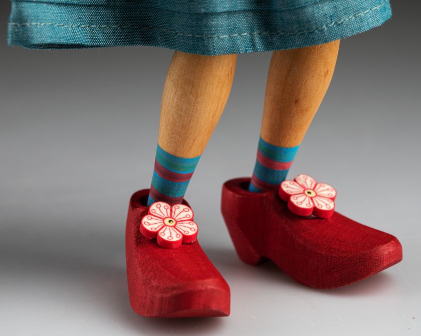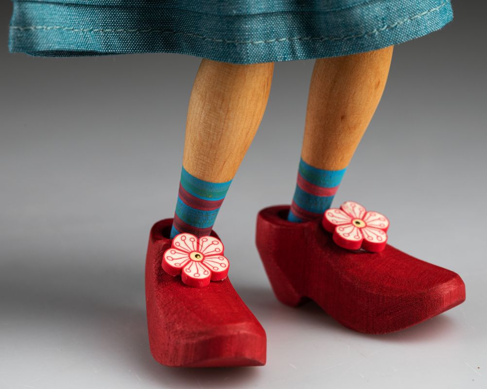 Son corps, ses bras et ses jambes sont en bois et elle porte une robe faite à la main de couleur bleue assortie à ses yeux.
