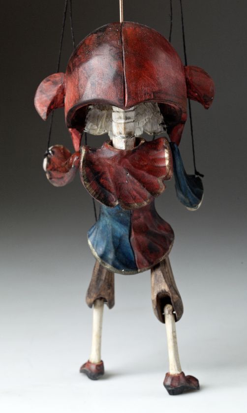 La marionnette superstar du bouffon mort est taillée à la main dans un bois de tilleul, peinte à la main avec plusieurs couches de peinture et recouverte d'une vraie cire d'abeille. Ses vêtements montrent la structure du bois et les couleurs intenses contrastent parfaitement avec son visage blanc. Elle est merveilleuse comme marionnette mais dans un groupe avec ses amis Superstar, elle est simplement radieuse!